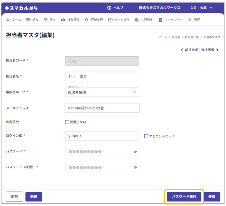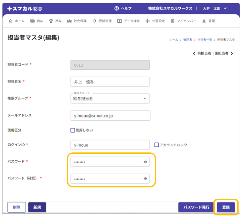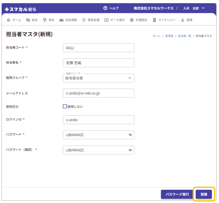 ②新規登録画面で必要な情報を入力します。パスワードは、手入力か[パスワード発行]で自動生成後、[登録]をクリックします。