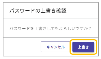 ②「パスワード」「パスワード(確認)」に直接入力をするか、[パスワード発行]をクリックし、上書き確認で[上書き]を選択します。