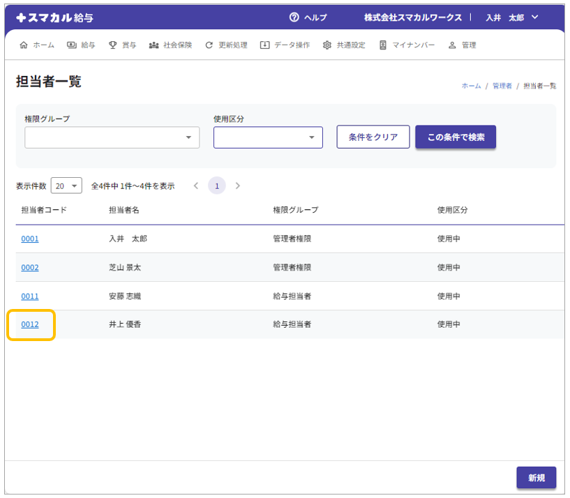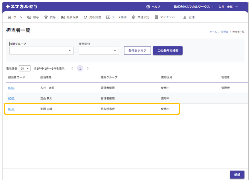 ④担当者一覧に新規登録した担当者が表示されていることを確認します。