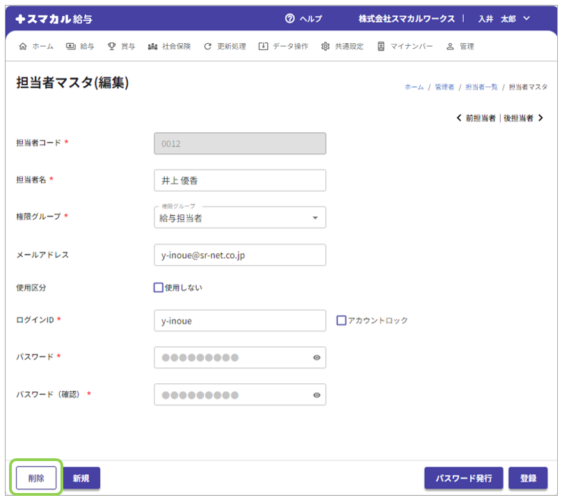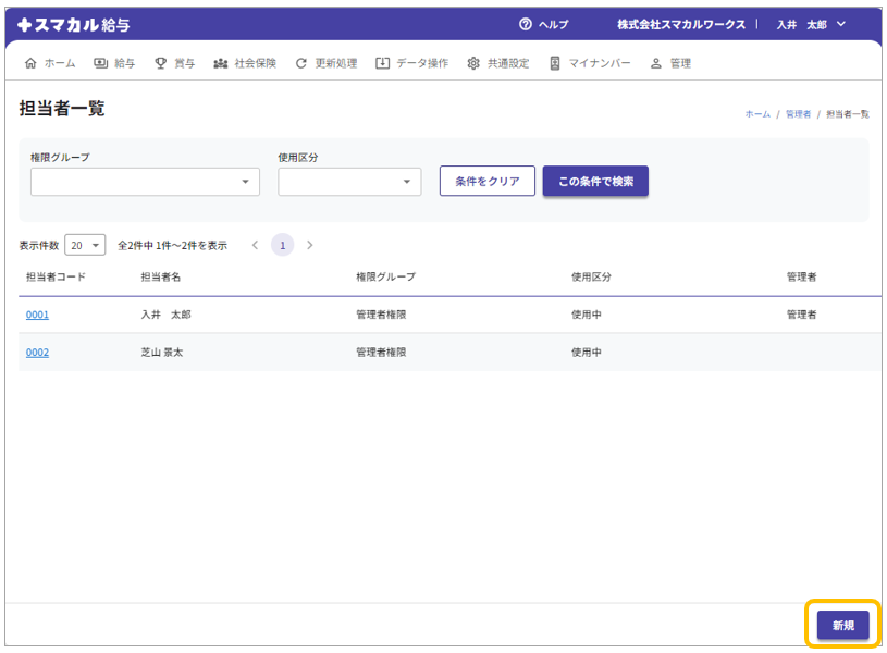 ⚠️[担当者一覧]は、権限グループが「管理者権限」で設定された担当者でスマカル給与にログインしている場合のみ操作可能なメニューです。