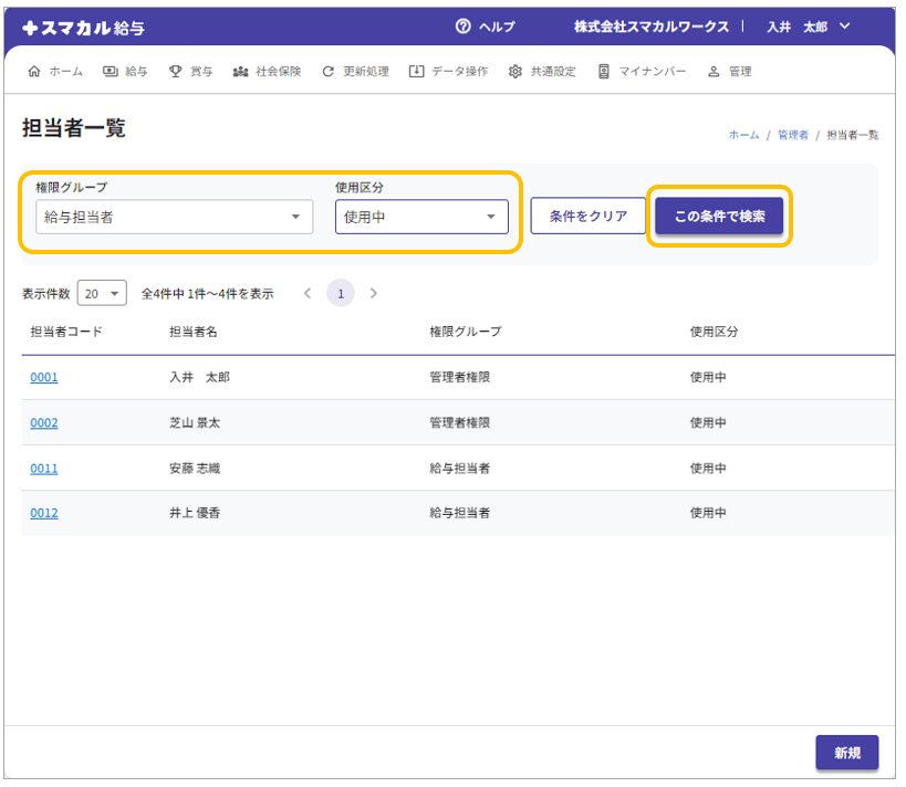 ①管理メニューから[担当者一覧]を開き、検索条件を設定します。