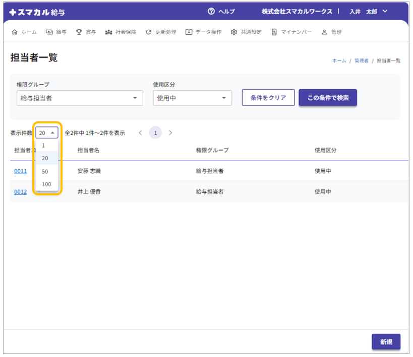 担当者一覧では、給与処理を行う担当者の以下の情報を確認・操作できます。