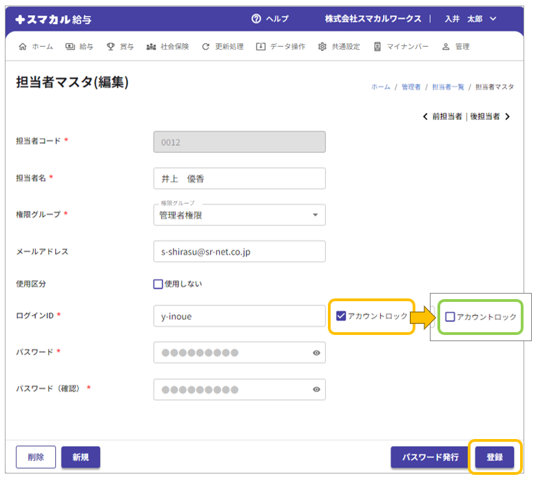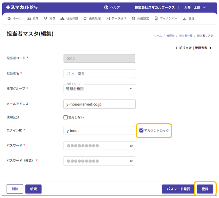 アカウントロック | 担当者のログインIDにロックをかける場合は、チェックを付けます。 ※ログインパスワードを5回間違えるとチェックが入ります。 30分経過後に正しいパスワードでログインができると自動で解除されます。 ただし、間違えるとアカウントロックは継続され、更に30分経過すると再度ログインを試すことができます。 30分経過前に解除する場合は、手動でチェックを外してください。 |