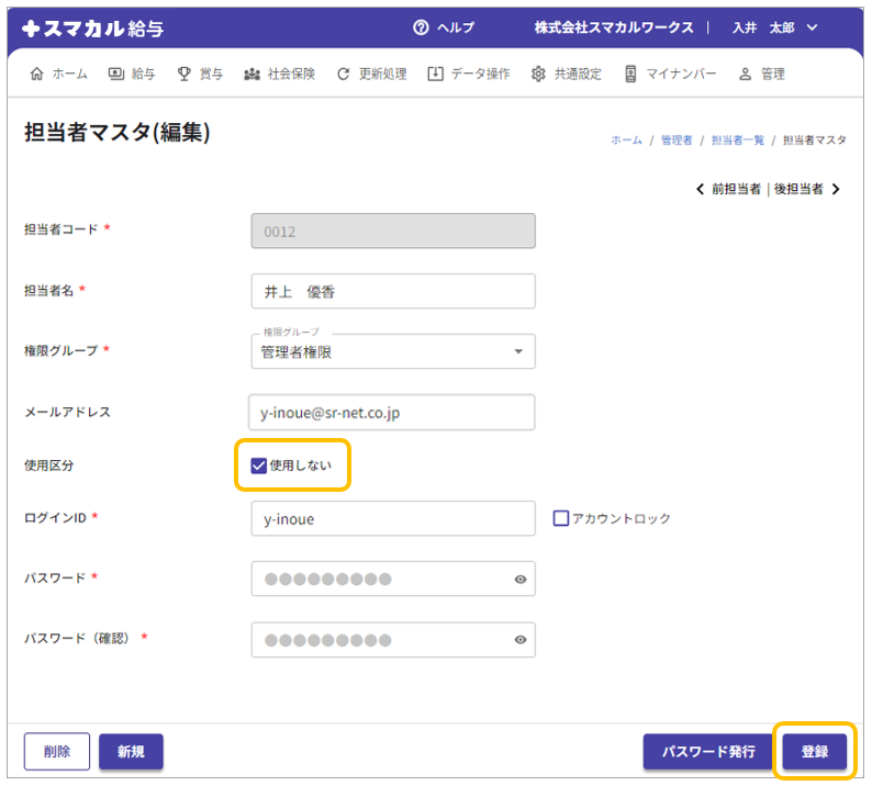 ※休職等で一時的に利用しない場合は、使用区分を「使用しない」にするとログインできなくなり、担当者リストも非表示になります。