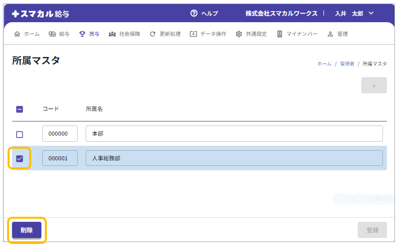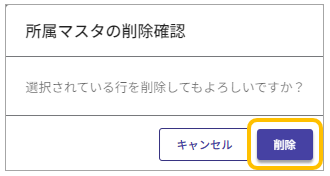①管理メニューから[所属マスタ]を開き、削除したいコード行にチェックを入れ、[削除]をクリックします。