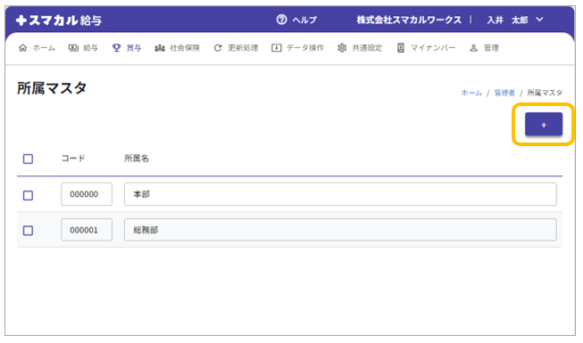 ①管理メニューから[所属マスタ]を開き、右上の[+]をクリックします。