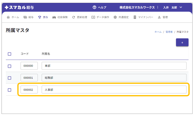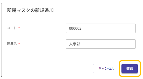 所属マスタでは、部署名などの従業員の所属先情報を管理します。