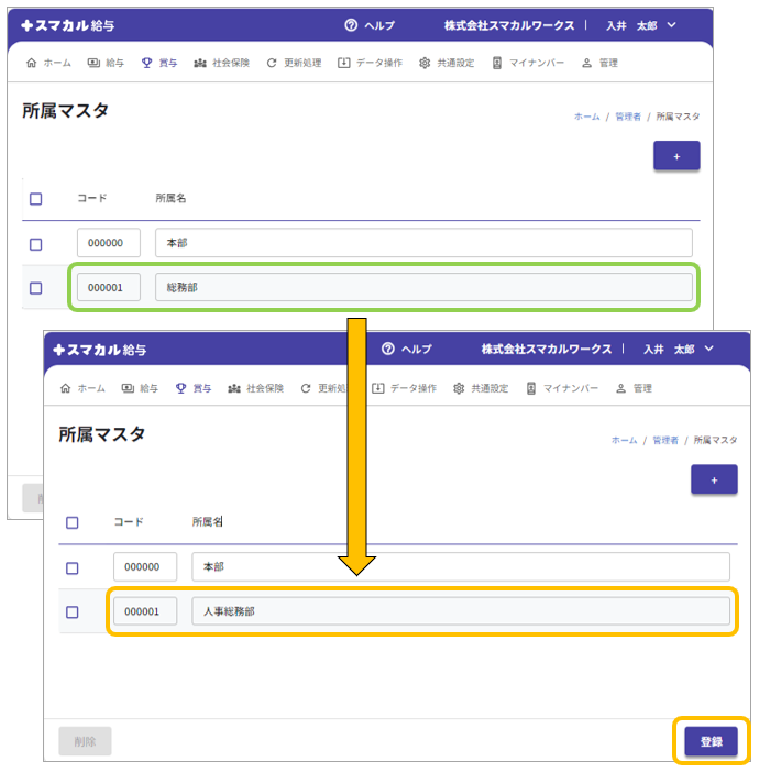 管理メニューから[所属マスタ]を開き、所属名を変更して[登録]をクリックします。