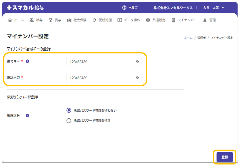 承認パスワードを設定する際は、先にマイナンバー復号キーを登録しておく必要があります。