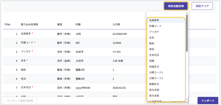 | 取り込み先項目 | スマカル給与側の項目名 |