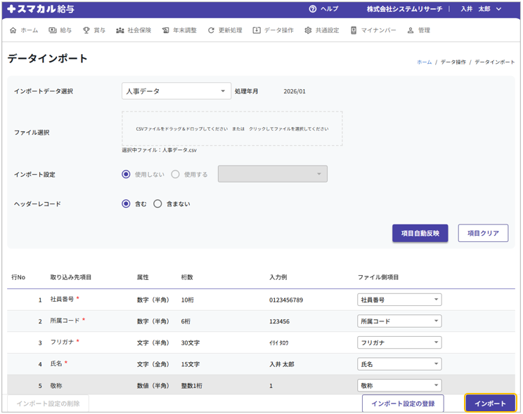 ①データ操作メニューから[データインポート]を開き、インポートデータ選択で「人事データ」を選択後、ファイル選択でインポートするCSVファイルを選択します。