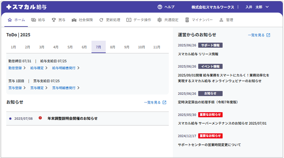 スマカル給与ホーム画面のメニューや表示アイコンの内容について説明します。