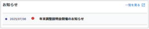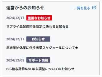 [お知らせマスタ]に登録した「お知らせ」が掲載され、タイトルをクリックすると本文の内容が閲覧できます。 右上の[一覧を見る]から過去のお知らせも閲覧できます。 ※日付の左横に「●」が付いたお知らせは未読 |