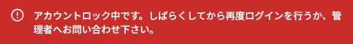 複数回のログイン失敗により一時的にアカウントがロックされています。 管理者に解除を依頼するか、30分以上経過してから再度ログインを行ってください。 |