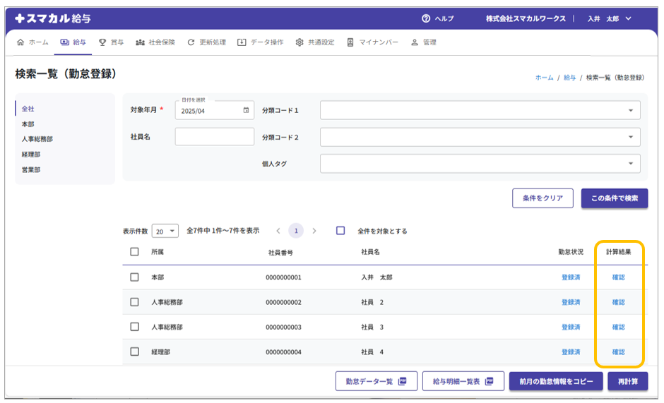 ②従業員の検索後、対象従業員行にある計算結果欄の[確認]をクリックします。
