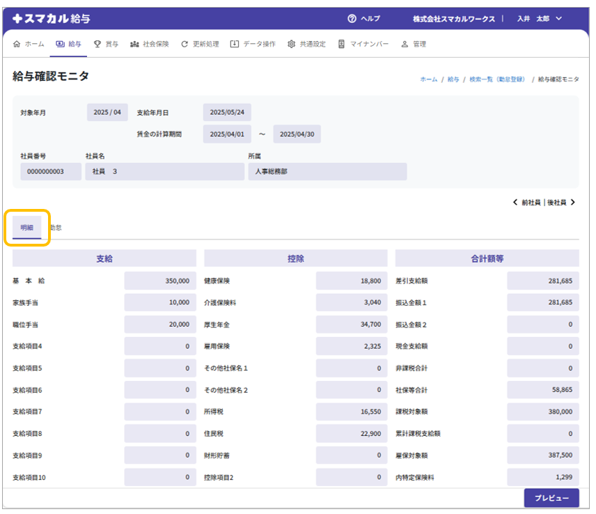 ⑤画面右下の[プレビュー]をクリックすると、給与明細書のプレビューが表示されます。