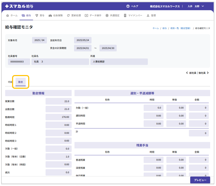 勤怠登録一覧で入力や登録をした結果、計算された給与計算結果を従業員毎にモニタで確認します。