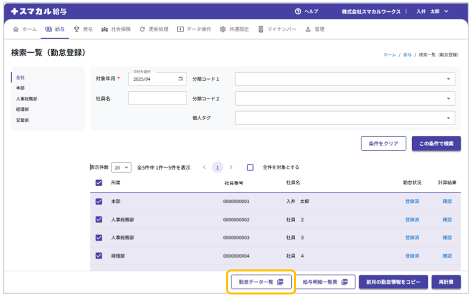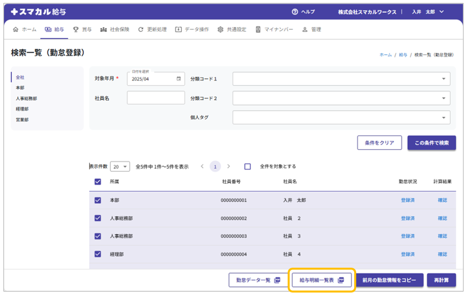 勤怠登録一覧で入力や登録をした結果、計算された給与計算結果を一覧表で確認します。