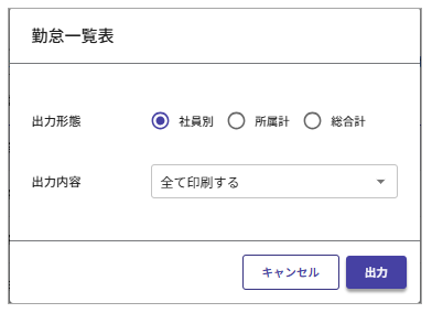 勤怠登録一覧で入力や登録をした勤怠データをもとに、各従業員の勤怠データ内容の一覧をPDF出力します。