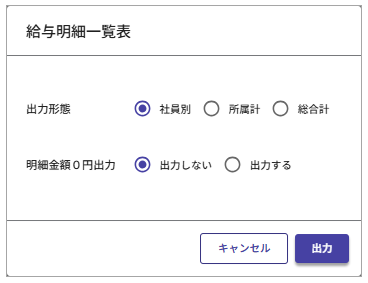 明細金額0円出力 | [人事マスタ]の就業区分が「在職」と「休職」の従業員で、かつ給与計算結果の支給・控除の全項目が0円の場合の出力を選択します。 ○出力しない 支給・控除の全項目が0円の従業員を出力しません。 ○出力する 支給・控除の全項目が0円の従業員も出力します。 |