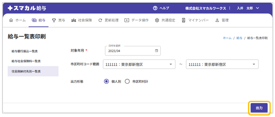 給与確定済みの計算結果をもとに、住民税の納付先別情報(市区町村コード/納付先市区町村名称/納付義務者指定番号/所属名/社員番号/社員名/納付金額)の一覧をPDF出力します。