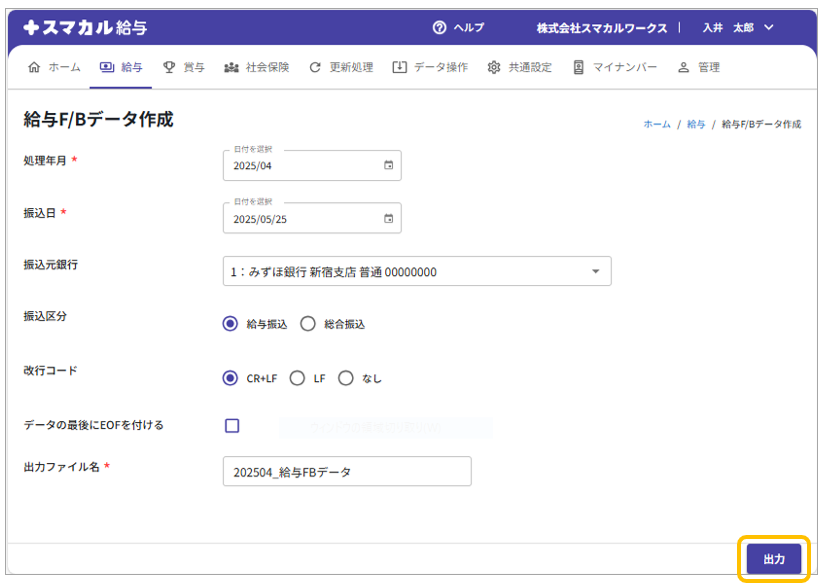 ① 給与メニューから[給与FBデータ作成]を開き、条件を設定し[出力]をクリックします。