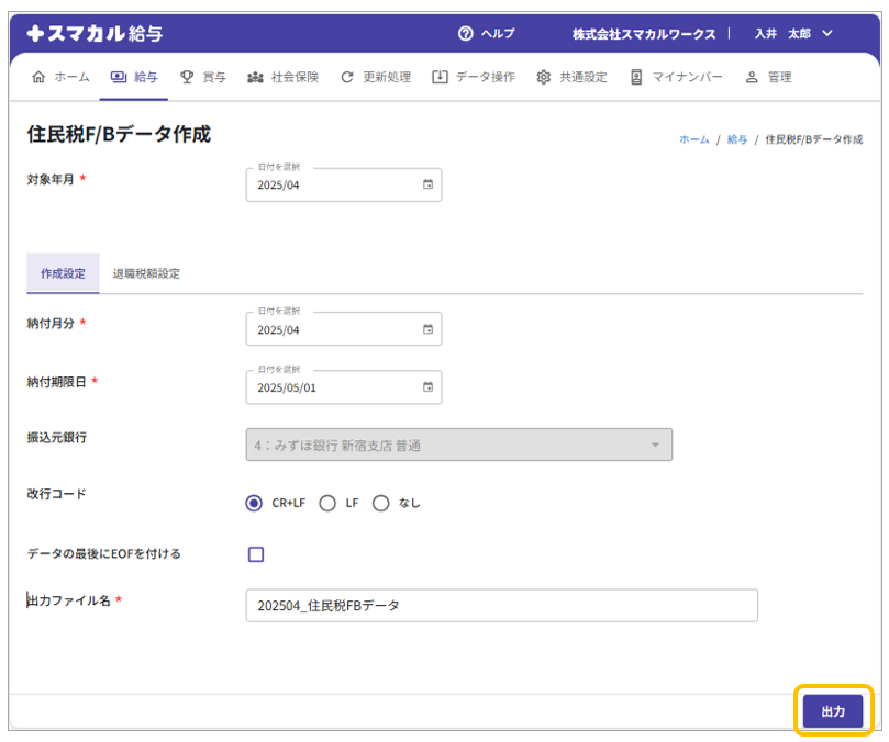 ①給与メニューから[住民税FBデータ作成]を開き、条件を設定して[出力]をクリックします。