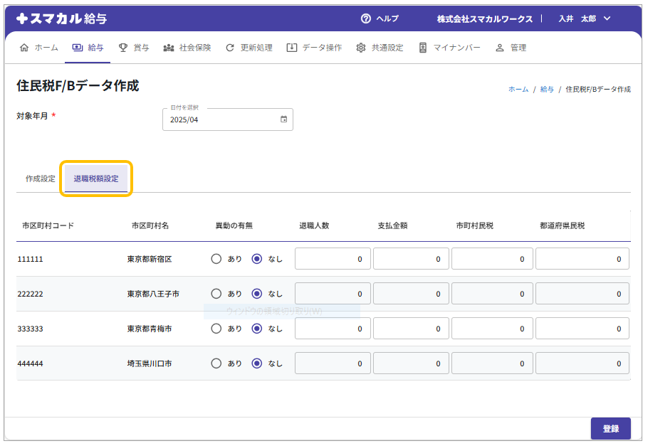 住民税FBデータ作成に退職税額の特別徴収を含める場合は、FBデータ作成前に市区町村別に退職税額を登録します。