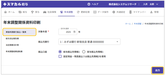年末調整確定済の計算結果をもとに、各従業員の銀行振込先情報の一覧を出力します。