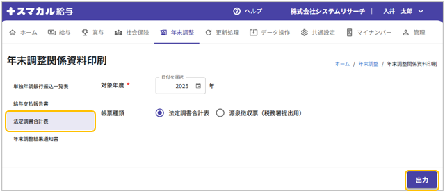 法定調書合計表の転記資料と源泉徴収票(税務署提出用)の出力できます。