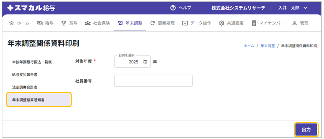 ①年末調整メニューから[年末調整関係資料印刷]→「年末調整結果通知書」の順に開き、条件を設定し[出力]をクリックします。