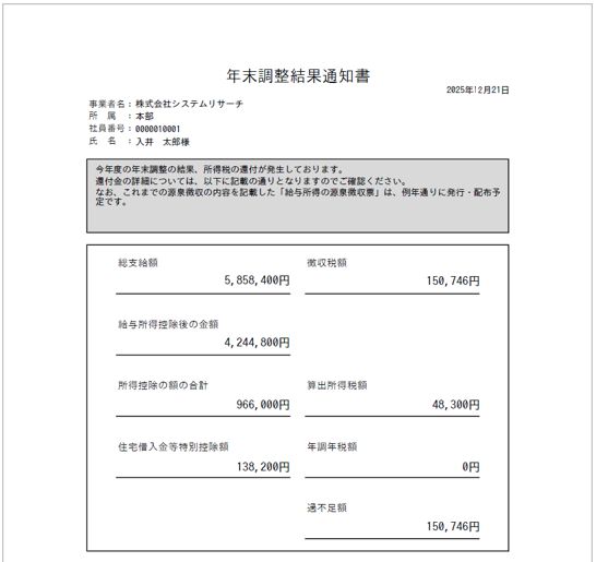 年末調整計算結果の通知時に使用する、年末調整結果通知書のPDFファイル出力ができます。