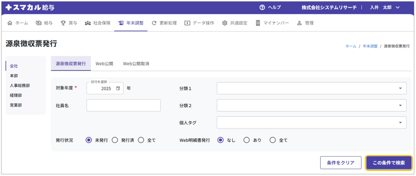 従業員個人に渡す源泉徴収票の発行対象の所属を選択し、後述の項目一覧を参考に条件を設定後[この条件で検索]をクリックします。