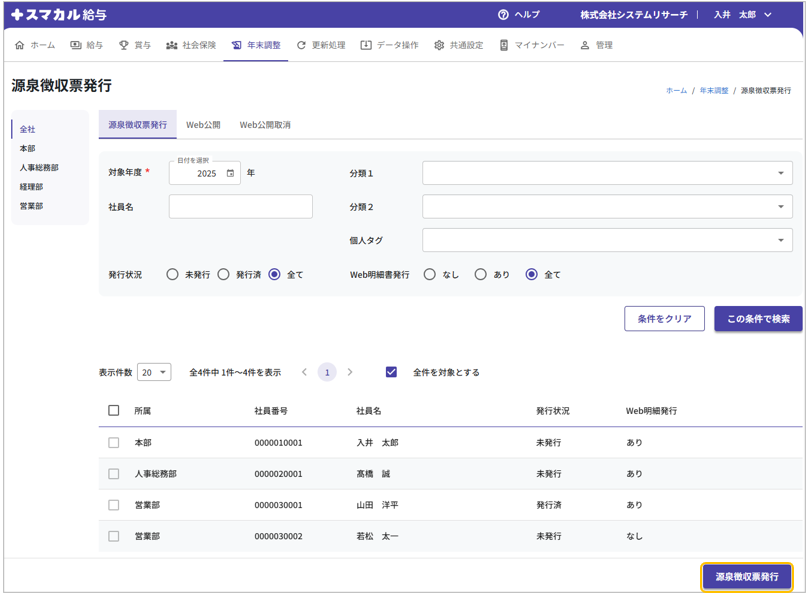 発行状況 源泉徴収票の発行状況を選択します。