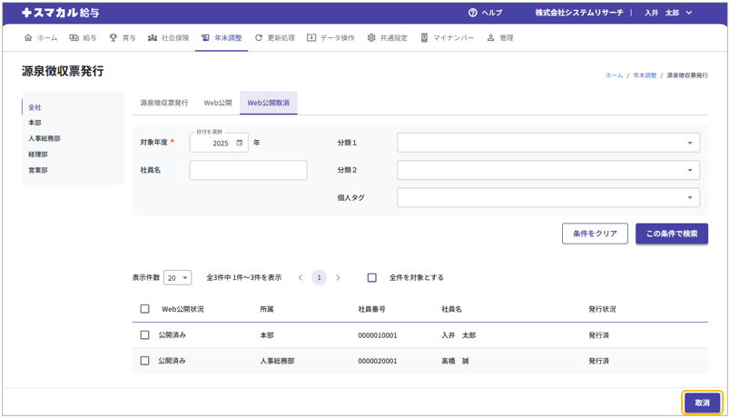 ①年末調整メニューから[源泉徴収票発行]を開き、「Web公開取消」タブを選択します。