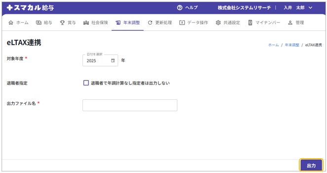 ①年末調整メニューから[eLTAX連携]を開き、条件を設定して[出力]をクリックします。