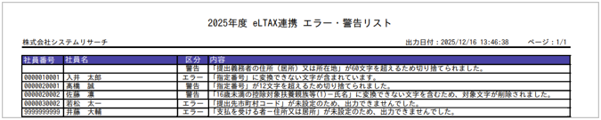 出力対象データにエラーや警告(内容は下記表参考)がある場合はメッセージが表示され、ブラウザの別タブにPDFで「20XX年度 eLTAX連携 エラー・警告リスト」が表示されます。