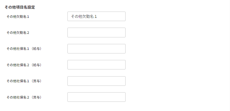 その他欠勤名1/2 | 看護休暇や介護休暇等、既存の勤怠項目のほかに欠勤に関する項目を使用したい場合に登録します。 |