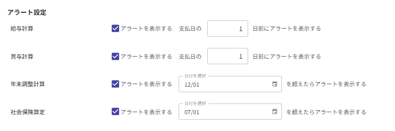 スマカル給与では、給与計算などの処理に関してアラートメッセージを表示できます。