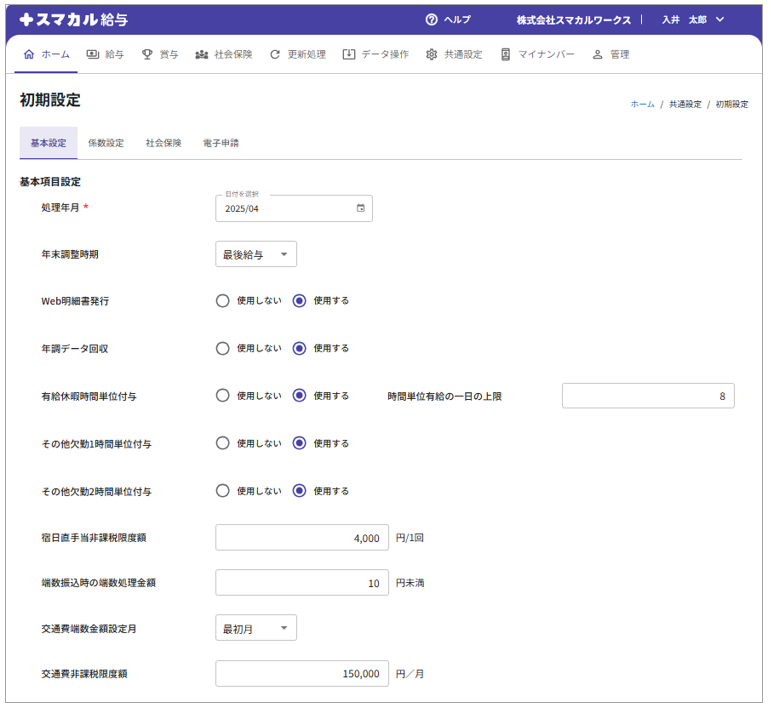 基本設定タブでは、処理年月や年末調整時期、各種アラート表示するための設定を行います。