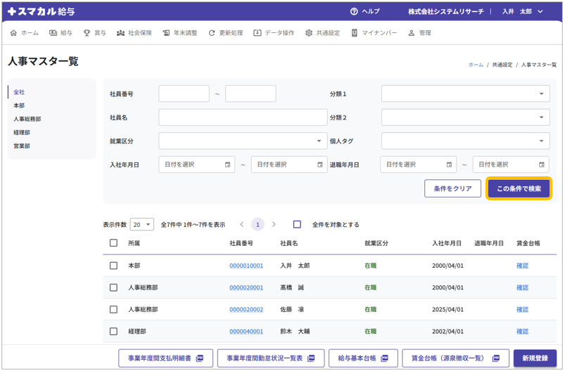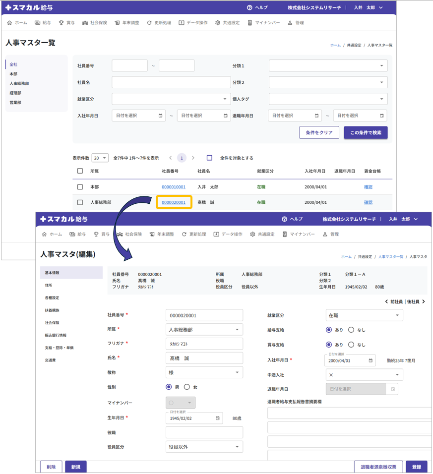 検索結果の「社員番号」をクリックすると、人事マスタ画面が開きます。