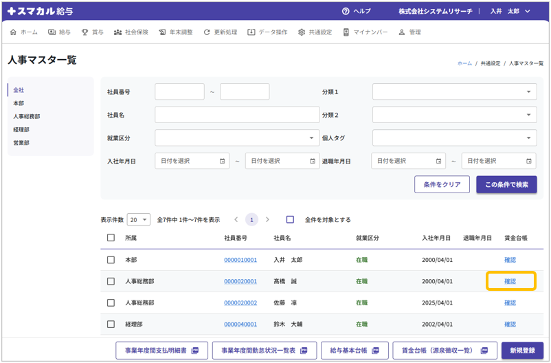 ①対象の従業員を検索し、確認したい該当従業員行の賃金台帳[確認]をクリックします。