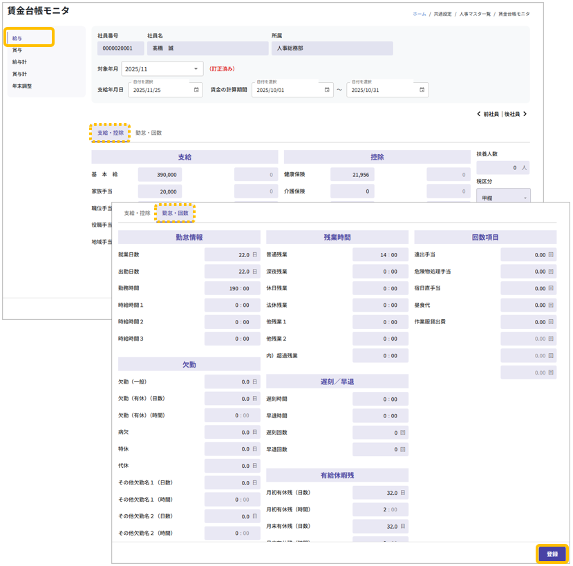 ②賃金台帳モニタ画面が開き、内容の確認ができます。