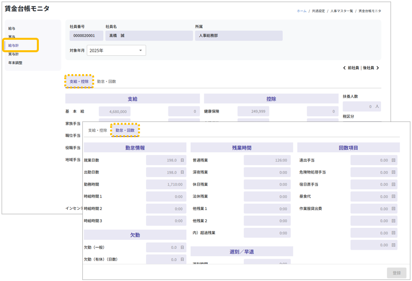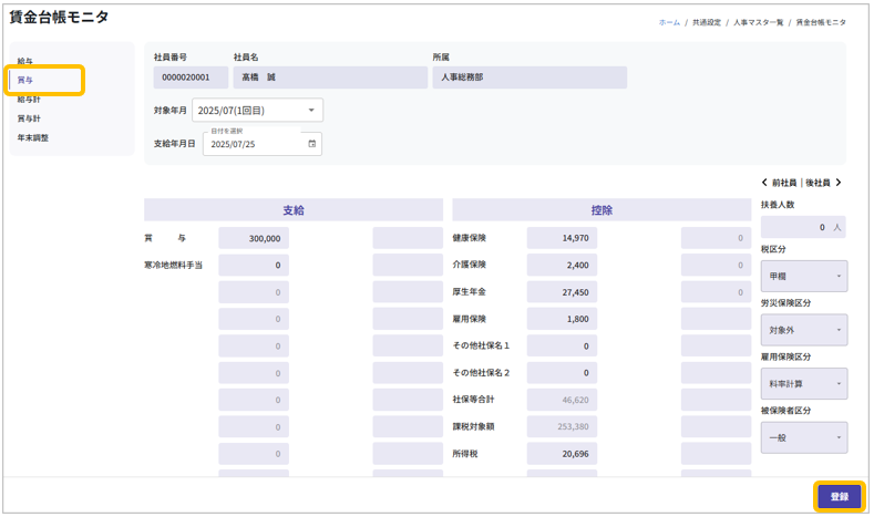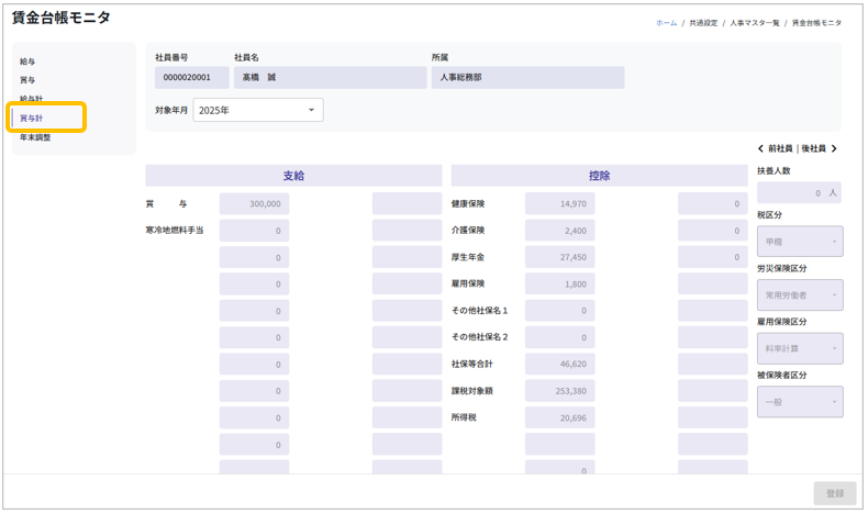 賃金台帳モニタでは、給与や賞与等の支給明細を確認することができます。