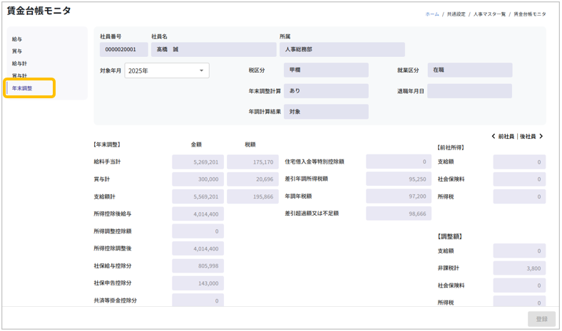 ※給与と賞与はデータの確認・変更・登録が可能で、給与計・賞与計・年末調整は対象年の集計が確認できます。