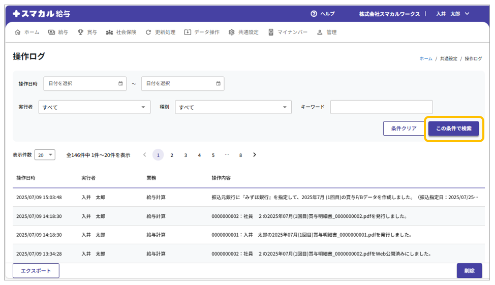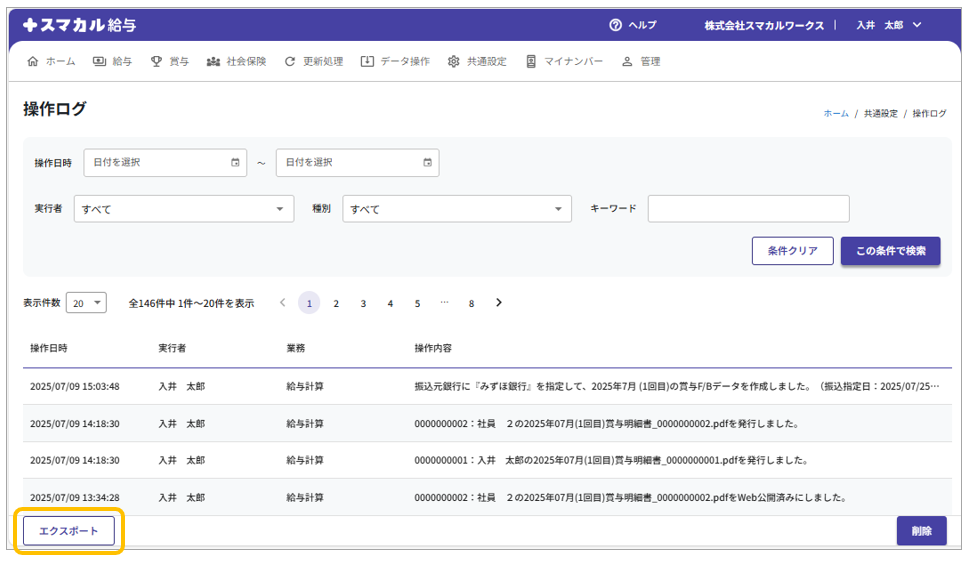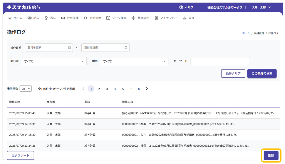 操作ログでは、スマカル給与の操作や一覧表・PDF作成などの操作履歴を一覧で確認できます。