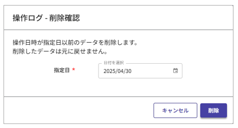 操作日時が指定日以前の操作ログデータが一括削除され、削除したデータは元に戻せません。