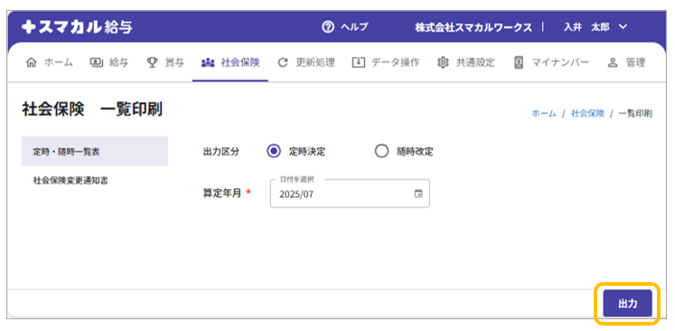 社会保険メニューから[社会保険一覧表印刷]を開き、[定時・随時一覧表]をクリックします。