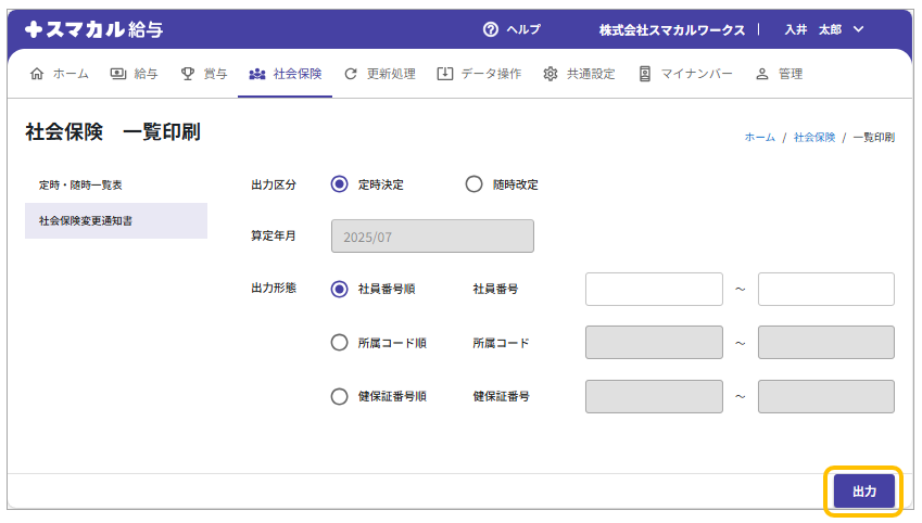 ①社会保険メニューから[社会保険一覧表印刷]を開き、[社会保険変更通知書]をクリックします。