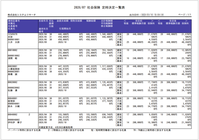 定時決定および随時改定の算出結果をもとに、一覧をPDF出力します。※1枚当たり6名(行)